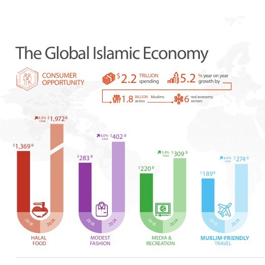 The 2019/ 2020 report published by Dinar Standard, estimates that Muslims spent US$2.2 trillion in 2018 across the food, pharmaceutical and lifestyle sectors that are impacted by Islamic faith-inspired ethical consumption needs. This spending reflects a healthy 5.2% year-on-year growth and is forecasted to reach US$3.2 trillion by 2024 at a Cumulative Annual Growth Rate (“CAGR”) of 6.2%. In addition, Islamic finance assets were reported to have reached $2.5 trillion in 2018.